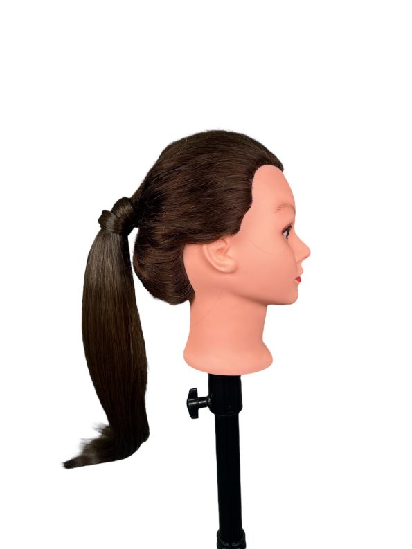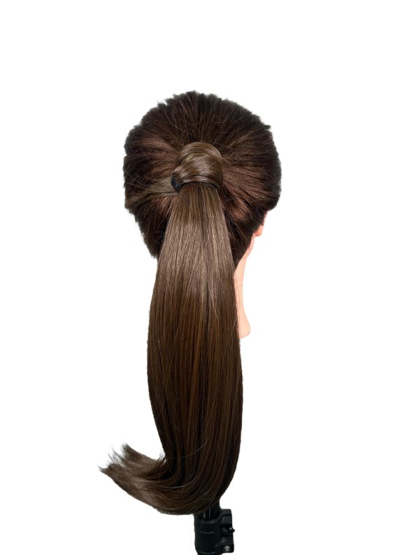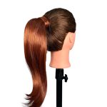Postizo de cabello sintético, manejable al calor, fácil colocación con velcro y peineta, largo aproximado de 36 cm. Soporta temperaturas de hasta 210 grados.