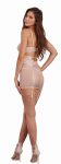 Incluye faldilla en color rosa palo de red con encaje y soporte para medias, sostén de encaje y red; y tanga.